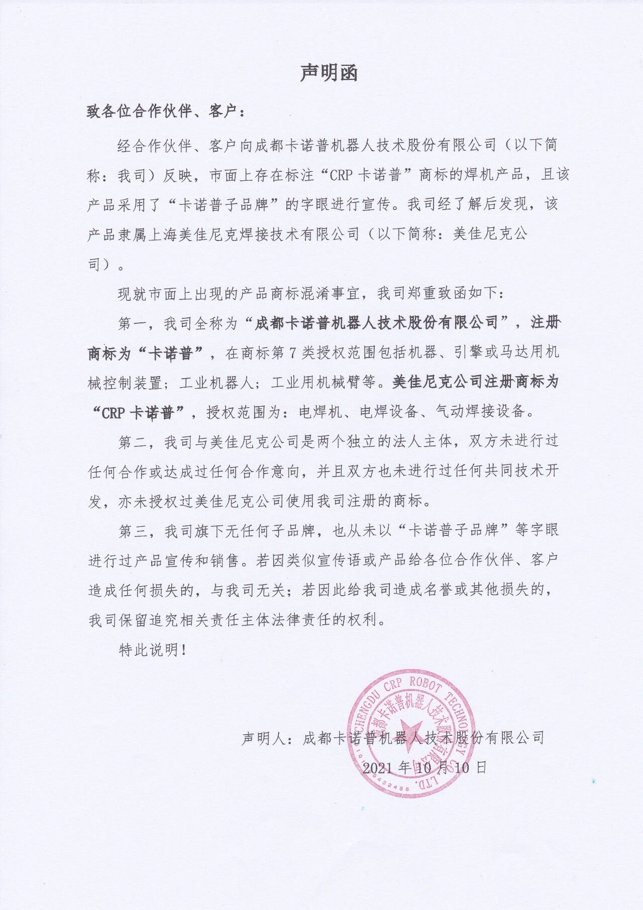 经我司了解后发现,该产品隶属上海美佳尼克焊接技术有限公司(以下简称:美佳尼克公 司)关于卡诺普的注册商标被混淆一事,与事实严重不符,由于该行为通过网络扩散,误导了一直关心和支持卡诺普的合作伙伴和经销商,造成了一定的影响与不便,有鉴于此,卡诺普现做澄清声明如下: