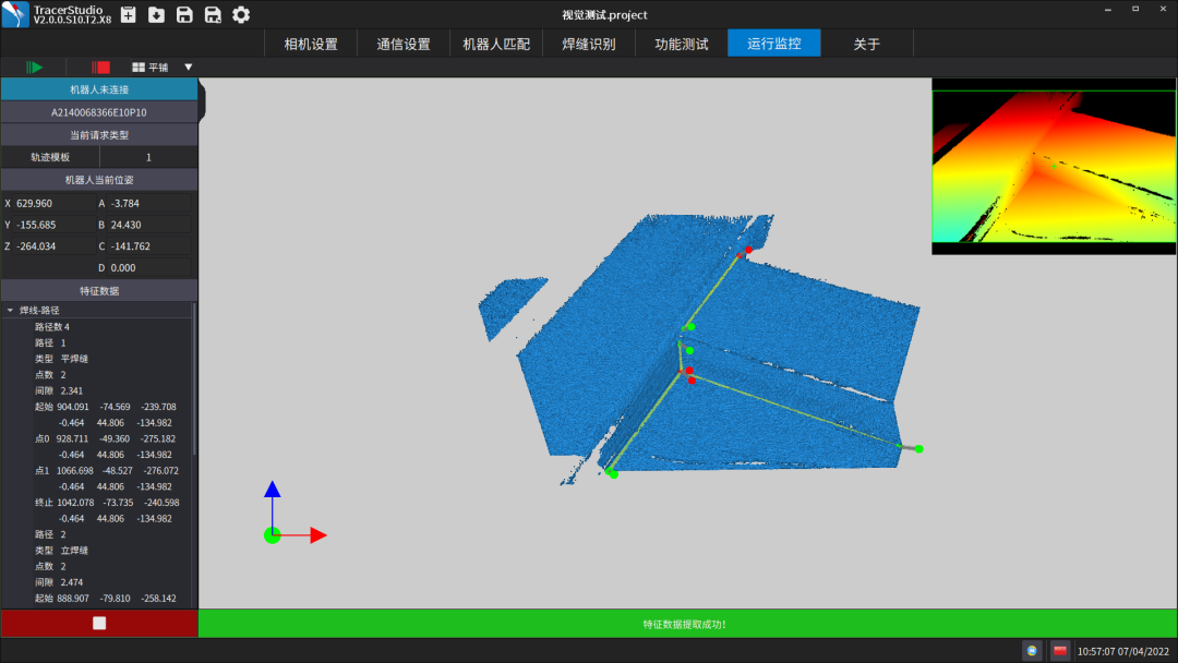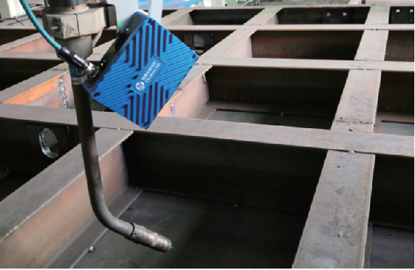该系统主要由卡诺普RH14-10机器人,3D视觉(系统主要由焊接专用3D相机Tracer P1、焊接视觉软件TracerStudio和控制器构成)和焊接电源组成;3D视觉反馈工件的全位姿信息,对机器人的精度要求较高。3D视觉智能焊接系统采用微结构光技术,实现焊件,面扫描,输出焊接轨迹,与机器人配合,能够实现复杂焊缝特征提取、轨迹寻位、工件找正定位等功能够满足钢结构建筑焊接的各项需求。卡诺普基于机器人3D视觉系统,特别适用于工字钢(H型钢),直角钢,矩形钢拼接成的钢结构类产品,如人防门,桥梁拱架。