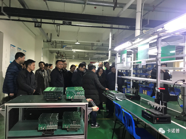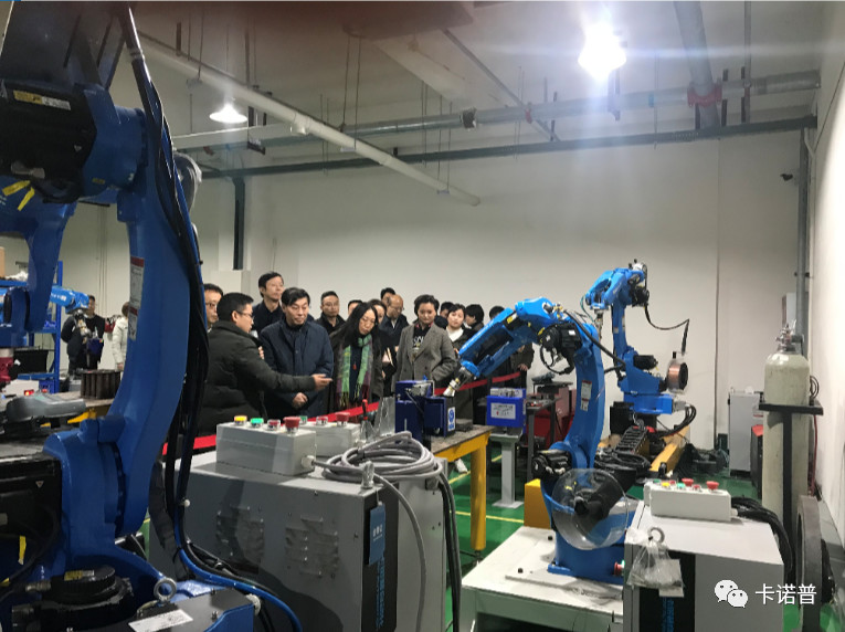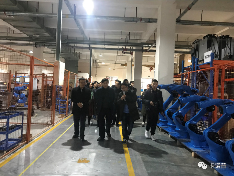 在卡诺普董事长李良军等的陪同下,邓主任一行人参观展厅历年推出的核心产品,了解公司发展历史、科研技术水平、产品年产量等情况,随后还参观了机器人整机生产车间、机器人测试实验室、研发中心、核心零部件生产车间。