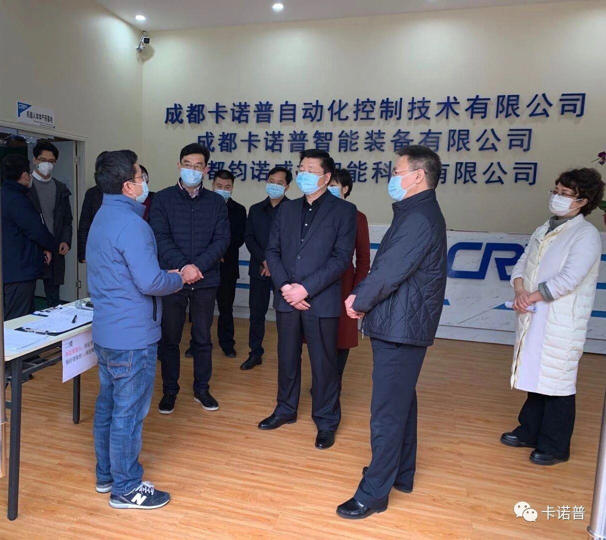 2020年2月26日下午,成都市委常委、统战部部长、市总工会主席吴凯,市委副秘书长廖冬云,市委统战部副部长黎邦华,市经信局副局长郑中礼,市经信局企业服务处处长李林深入卡诺普开展企业复工调研工作。成华区人民政府党组成员、副区长,龙潭总部新城党工委书记邓旭,成华区人民政府党组成员、龙潭总部新城党工委副书记、管委会主任余雅宾等区领导陪同调研。