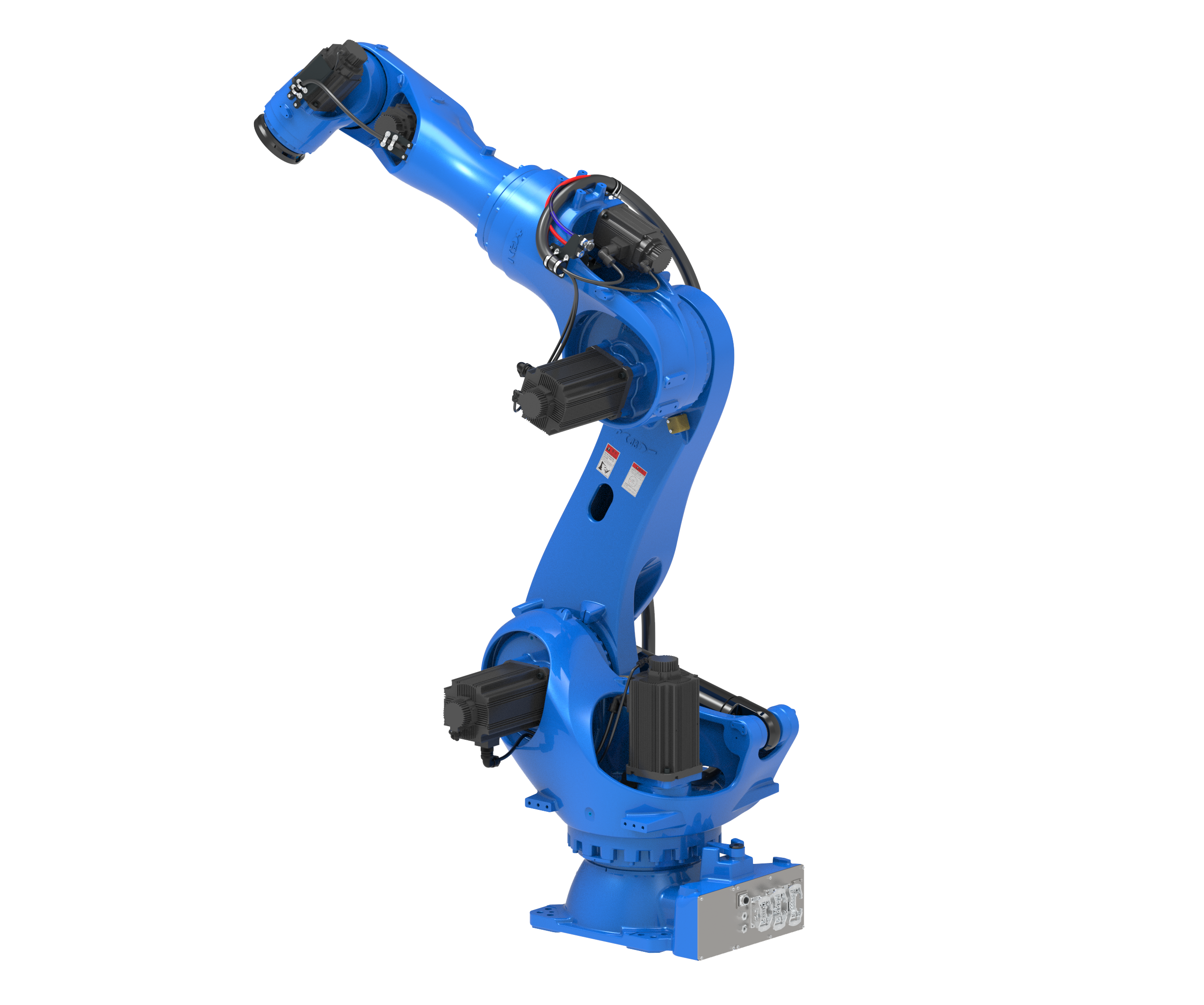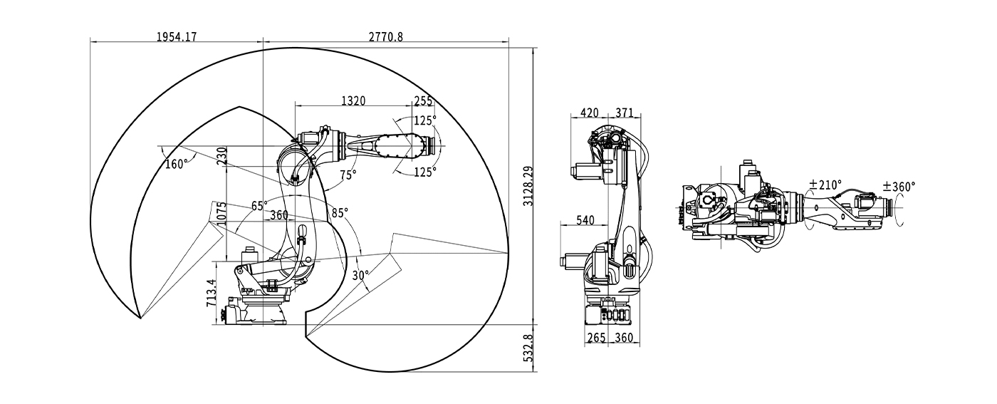 本体采中空⼿臂结构与内置⼿腕电缆,⽆需考虑外部缠绕⽅式导致与相邻机器⼈或周边设备相互产⽣的⼲涉。