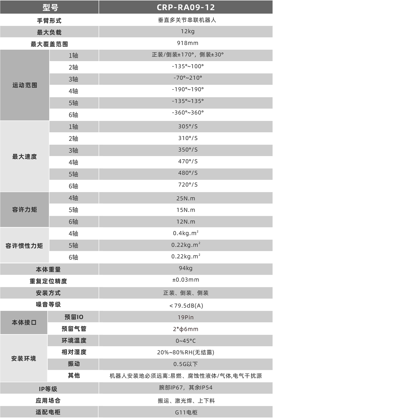 本体采用高刚性设计方案,其刚性更高。内部全封闭方案,小臂防护等级达IP67,负载更大,范围更广,机器人负载12kg,臂展为900mm,机器人手腕具备更高的扭矩和惯量,负载承受能力更强,应用的场景更广。