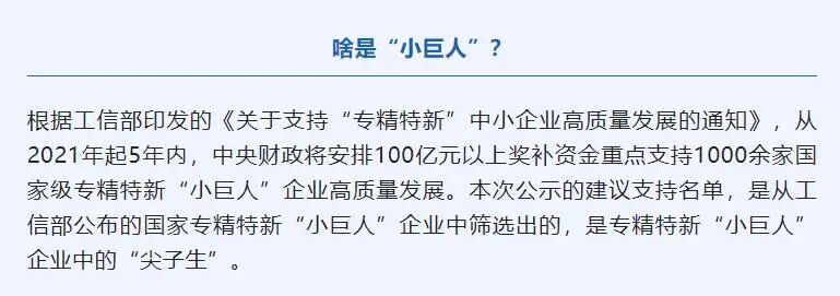 “专精特新”是目前中小企业高质量发展的重要看点,“小巨人”则是其中的佼佼者,是专注于细分市场、创新能力强、市场占有率高、掌握关键核心技术、质量效益优的排头兵企业,以“补短板”“填空白”,解决“卡脖子”为主。