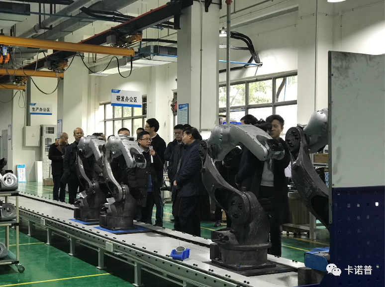 在卡诺普董事长李良军等的陪同下,邓主任一行人参观展厅历年推出的核心产品,了解公司发展历史、科研技术水平、产品年产量等情况,随后还参观了机器人整机生产车间、机器人测试实验室、研发中心、核心零部件生产车间。