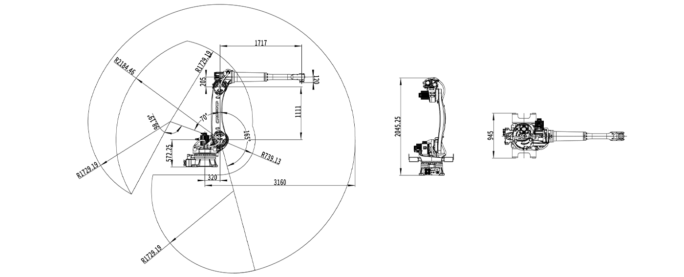 臂展3.2⽶,负载能⼒强,⼯作范围⼤,灵活性强。