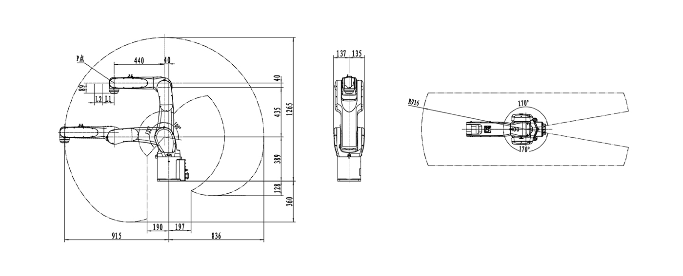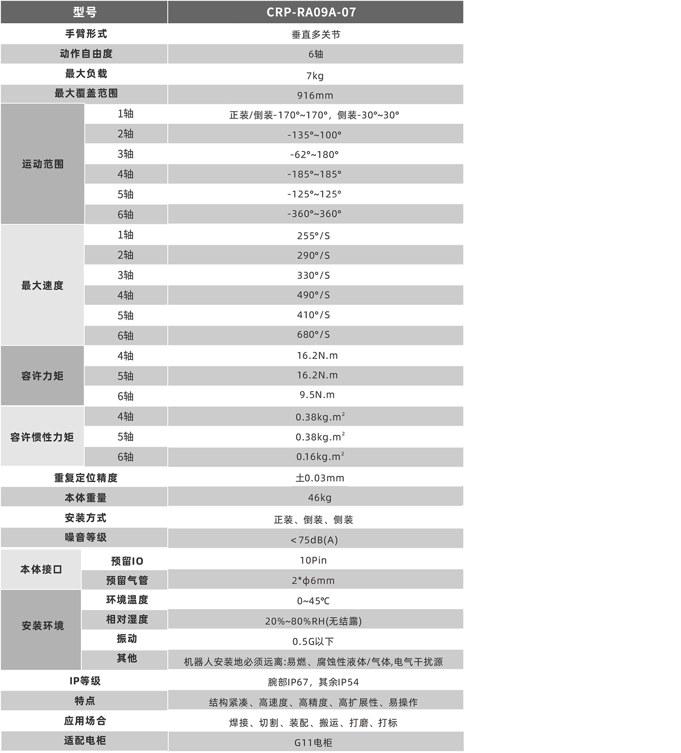 臂⻓916mm,⼿腕负载容量⼤,额定负载7kg,可轻松应对多种应⽤场合。