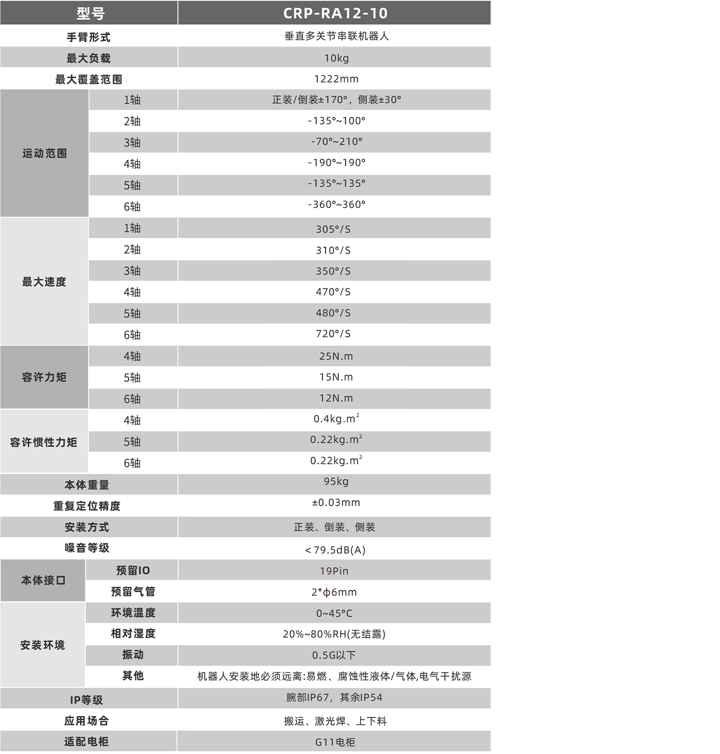 本体采用高刚性设计方案,其刚性更高。内部全封闭方案,小臂防护等级达IP67,负载更大,范围更广,机器人负载10kg,臂展1200mm,机器人手腕具备更高的扭矩和惯量,负载承受能力更强,应用的场景更广。