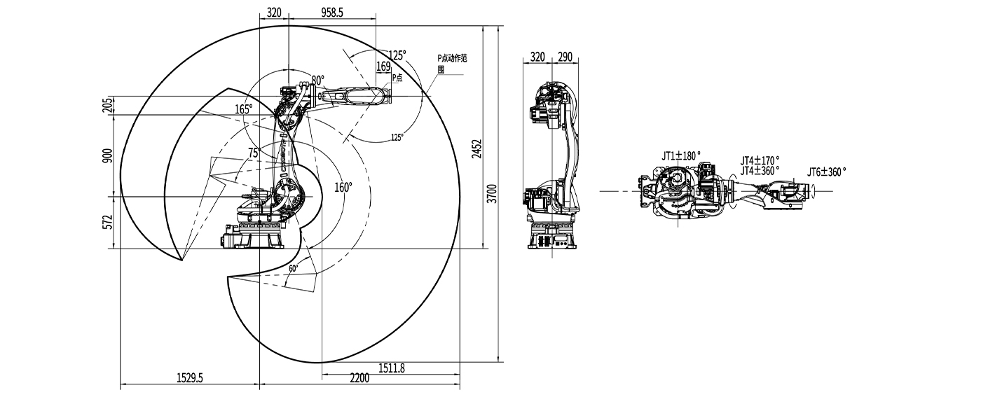 内置电缆、气管,通过小臂和手腕中心处设置中空部分,从机器人基部到腕部末端内置电缆和气管, 更大地方便了用户使用,提高了作业效率。